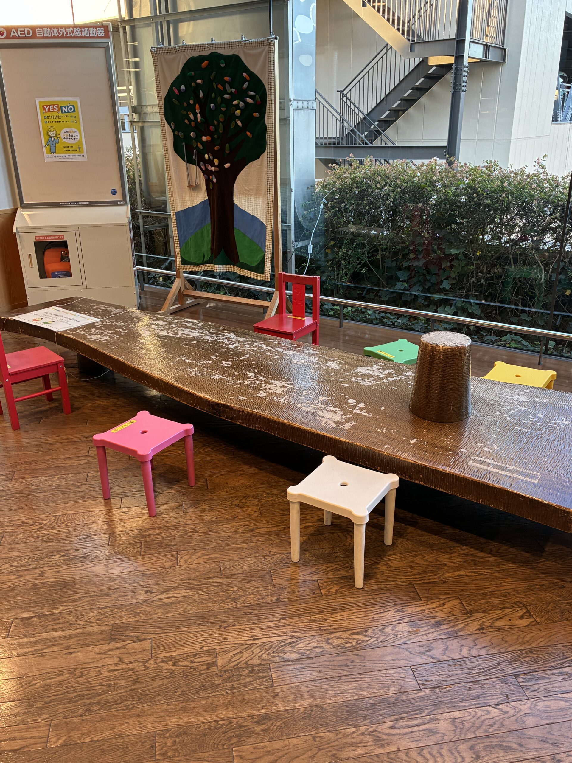 写真はベルブ永山のこどもコーナー。どこかで見た、というか座った記憶がある元なにか。こども用テーブルになって活躍中なのね~。