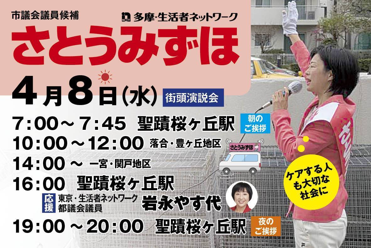 2026年4月8日 / 最終更新日 : 2026年4月8日 tama トピックス 4月8日(水)の予定 選挙、中日となりました。今日も元気に政策を届けます。 FacebookXBlueskyHatenaCopy